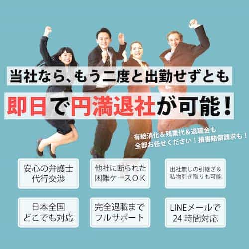 特に『弁護士法人みやび』では、「二度と出勤せず、即日に退社が可能」という退職代行を行なっています。